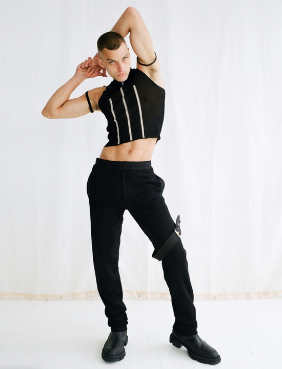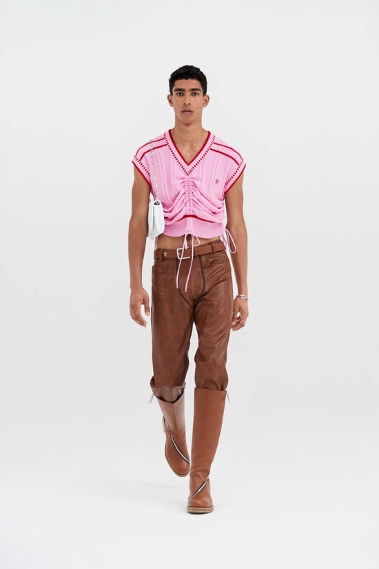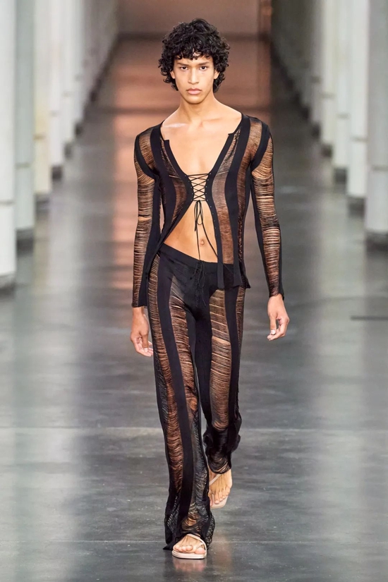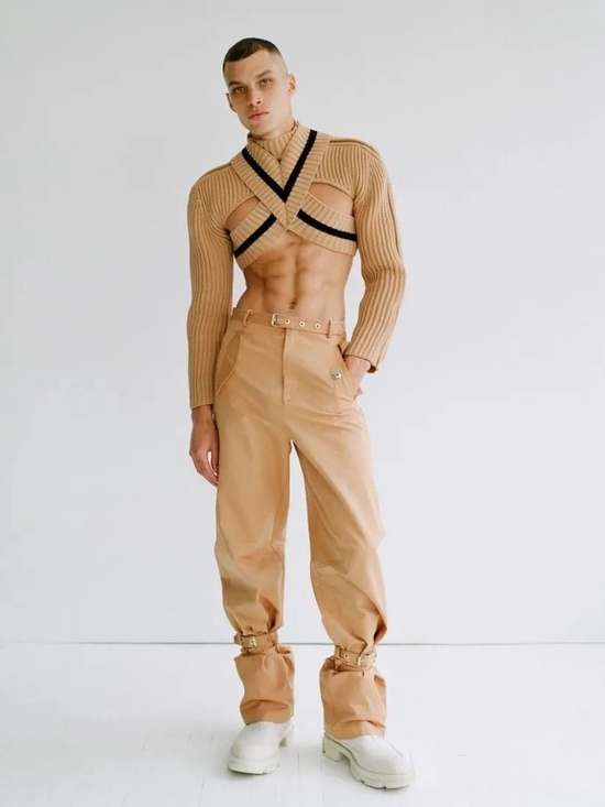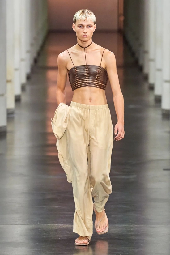 极为火辣的法国品牌 Ludovic de Saint Sernin ,在 2022 的春季男装秀 T 台上,设计师将细小的皮革股线、精致半透明面料制作成男女皆宜的紧身 Crop top ,性感气息扑面而来。
