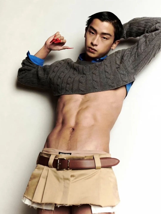 前不久,模特高野友吾手上涂着红色延长美甲,以大方展露腹肌的形象完美演绎 Miumiu 的女装露脐衫,引发不少时尚媒体刷屏报道。