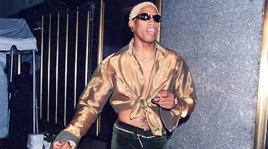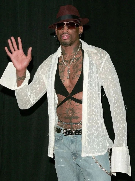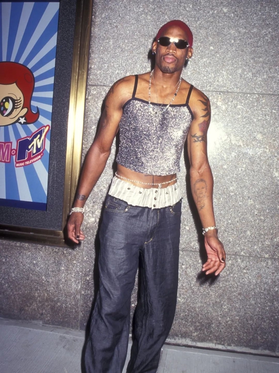 以及热衷以颠覆男性气质装扮的 NBA 球星 Dennis Rodman ,不仅早于当代 rapper 们迷恋于涂指甲油,更是曾在多个公开场合中,穿着闪钻露脐装、深 V 领镂空上衣等装扮示人。