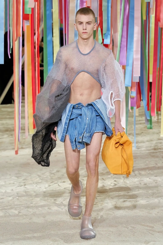 在 LOEWE 2022 秋冬系列中,Anderson 放飞自我般的采用打造出极具俏皮、荒诞色彩的单品,而露脐衫也同样存在其中。与自家品牌不同的是,这些单品由多种色彩的宽松、轻薄的透视面料制成,完美身材更是一览无余。