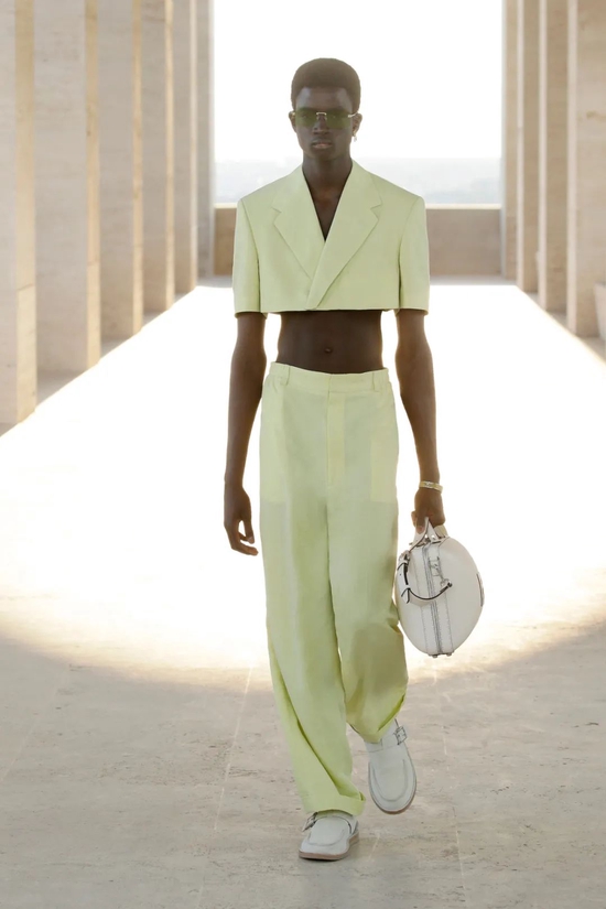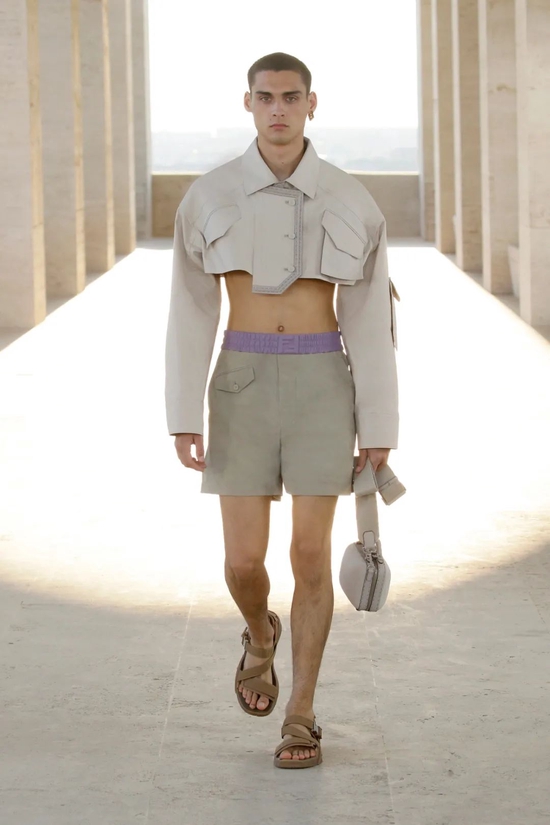 此外,同样迷恋露脐衫单品的还有 Fendi 。在春季男装系列中,品牌选用低保和色系打造风衣、西装套装及衬衫等单品。相比于其他品牌的张扬风格,Fendi 家的 Crop top 单品则更显一丝优雅格调。