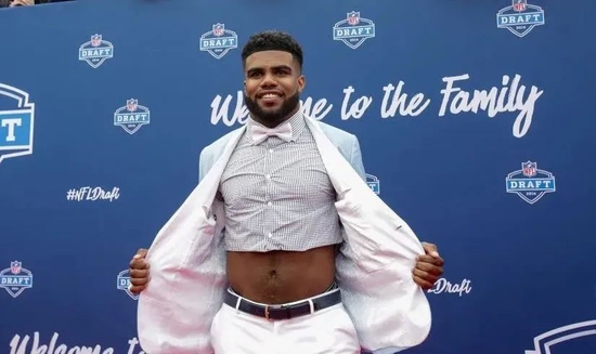 再往前追溯至 2010 年代,说唱歌手 Kid Cudi 穿着宽松的红色露脐衫和蓝色短裤登上他 2014 年的 Coachella 演出;而 NFL 球员 Ezekiel Elliott 在 2016 年 选秀中以露脐衫造型向雌雄同体艺术家 Prince 致敬。