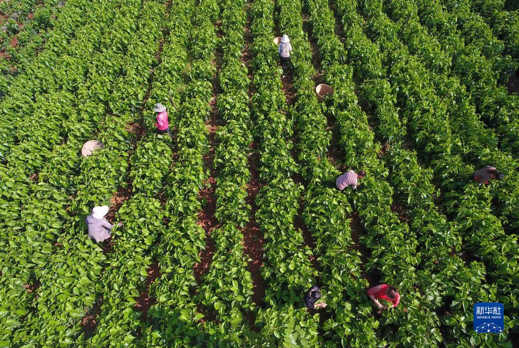 云南寻甸县金所街道草海子村的农妇在采摘蚕桑叶(2020年5月16日摄,无人机照片)。当地大力发展蚕桑等特色种养殖和加工产业,带动农民脱贫增收致富。新华社记者 杨宗友 摄