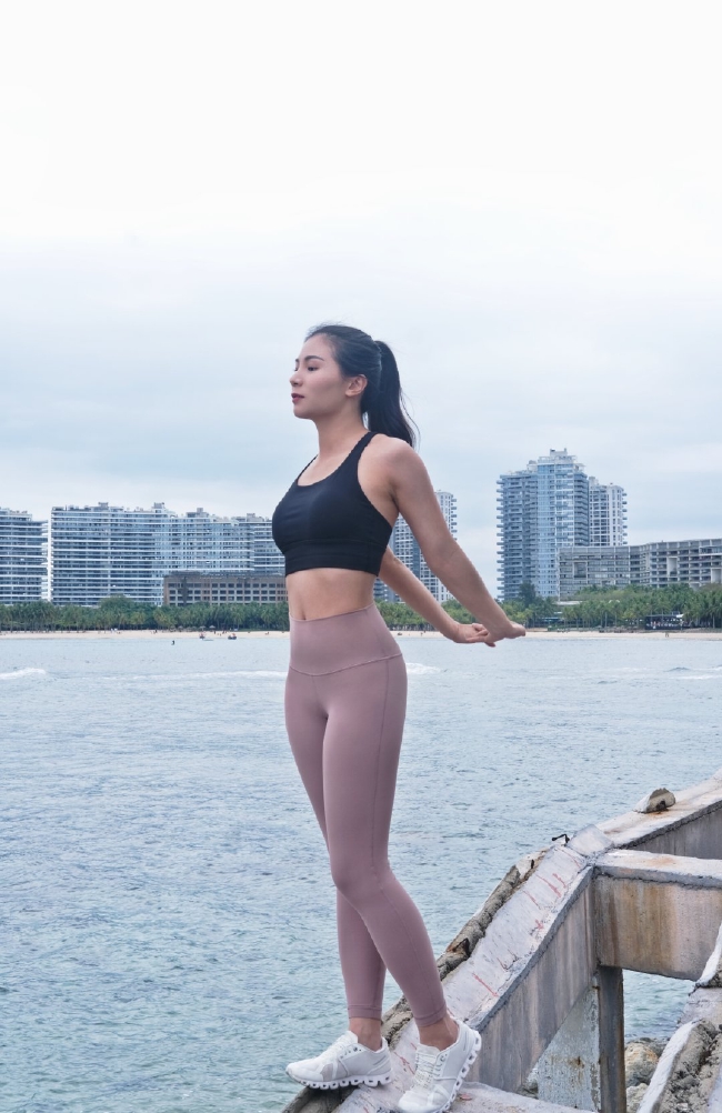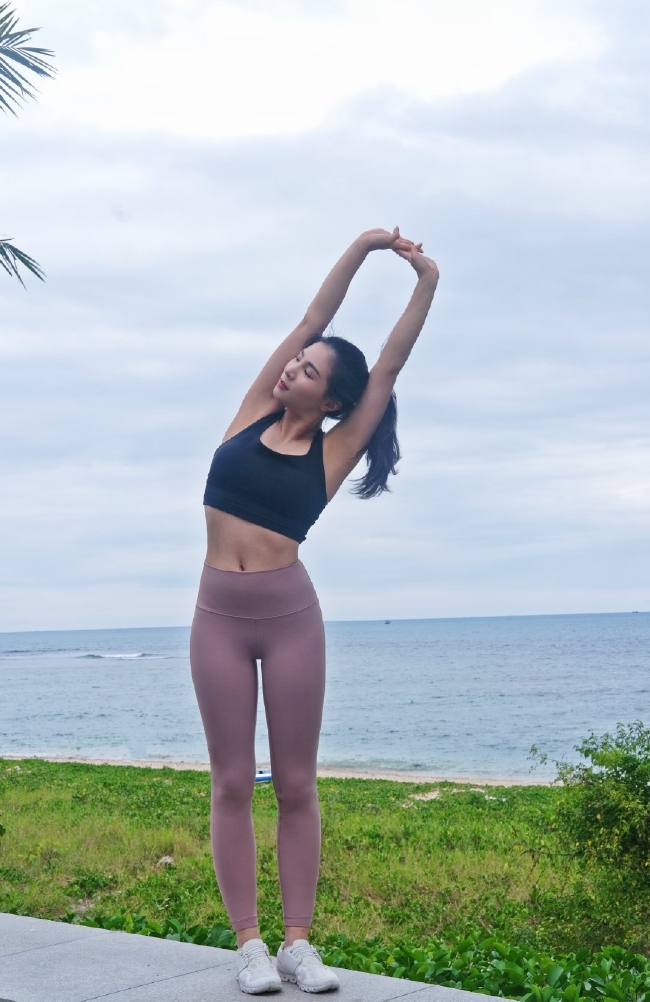 照片中何姿身着紧身运动服,身上一丝赘肉都没有,在海边做着拉伸的动作。