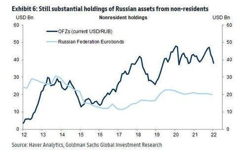 尽管外国持有俄罗斯主权债务的比例一直在下降,但规模仍然较大。如果俄罗斯当局无法动用这些储备中的很大一部分,那么这些投资组合的投资者可能会进一步遭受巨大损失(按市值计算),尤其是考虑到俄罗斯主权债务评级被下调的情况。