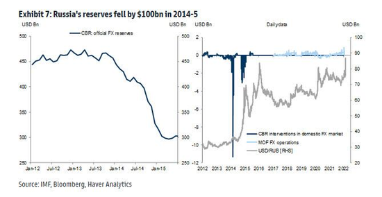 这一系列制裁行为,使人们很难量化其对俄罗斯资产的影响。但有一个参考基准是2014-2015年期间俄罗斯外汇储备的流失程度。图7显示,在此时间内俄罗斯的美元储备下降了1000多亿美元。
