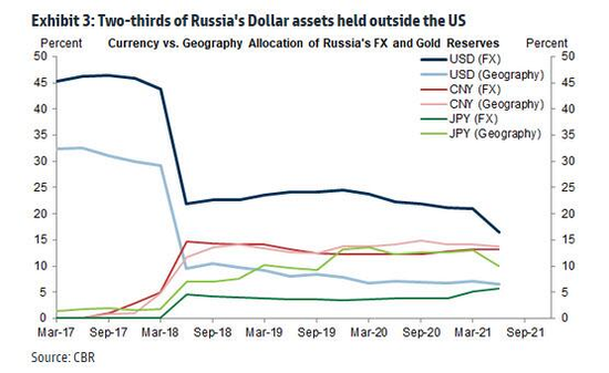 据俄罗斯央行,其大部分货币(非黄金)储备存放在中国(18%)、法国(16%)、日本(13%)和德国(12%)。俄罗斯央行和其他国际消息来源的披露表明,俄罗斯的储备资产可能更多的是从纽约联储的托管账户流向了欧洲、中国和日本等地区。