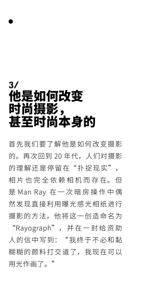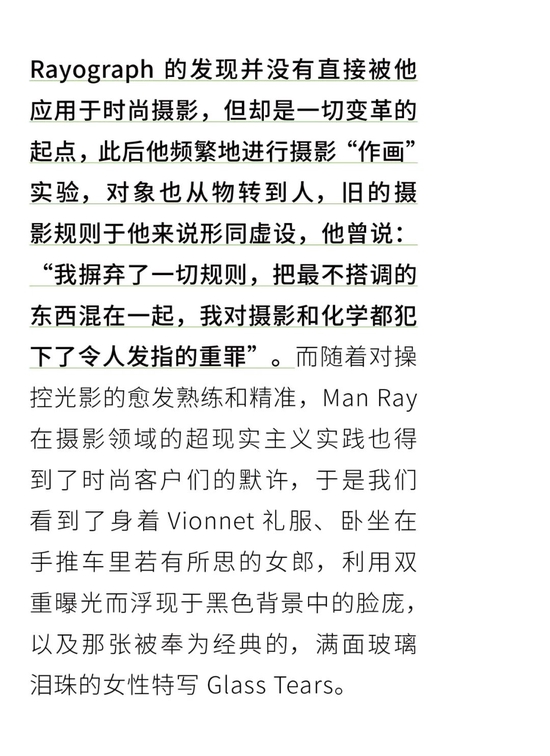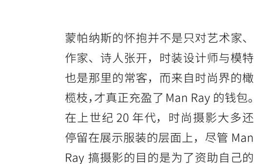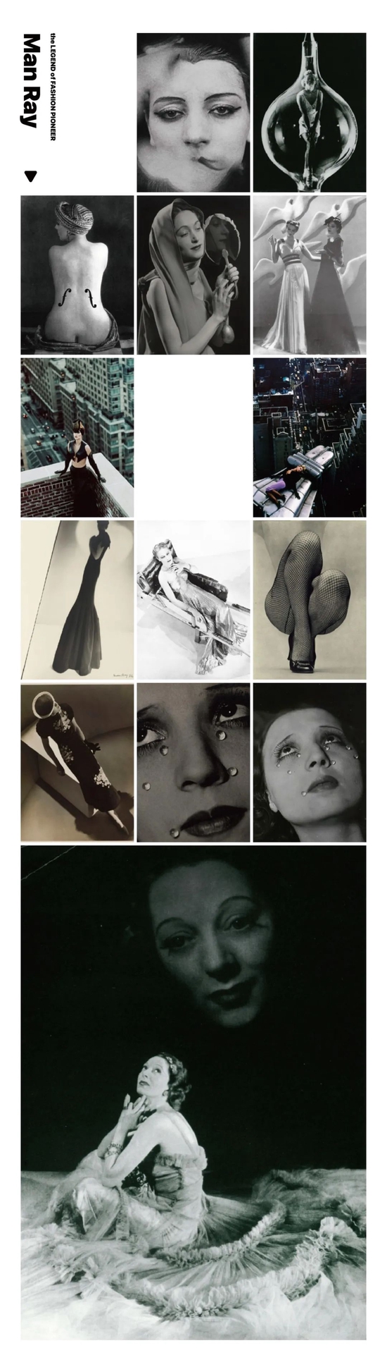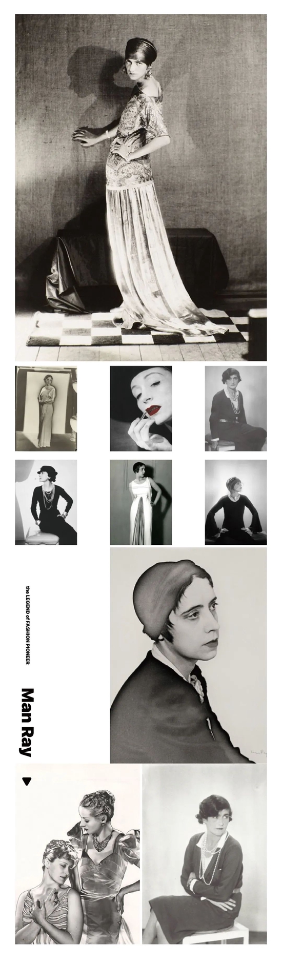 Man Ray 于 1974 年离世,尽管他早早便放弃了摄影,但却在短暂的 20 年里,留下了那个时代最历久弥新的影像,也重塑了摄影——这门光的艺术。他跳脱出时尚摄影原有的框架,以光为笔,将眼前的对象与内心所见的景致一并倾注在摄影之中,一种新的艺术也随之诞生了。同样的,Man Ray 融汇了达达主义与超现实主义叙事语言的时尚摄影, 也彻底的改变了摄影与时装的关系——二者不再有主次之分,时装成为摄影的内容,摄影也成为时装的诠释,而他在所缔造的光影世界中,艺术与时尚相互成就,在碰撞中击碎了彼此的边界,完成了质变。