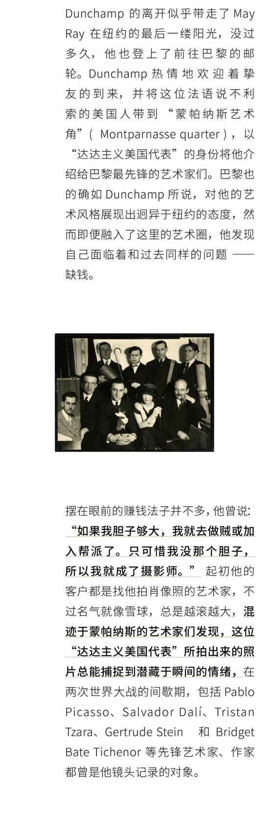 《尘埃》虽然并未像《喷泉》(杜尚的小便池)那样引起艺术界的震动, 但 Man Ray 在摄影中所呈现的细节也 暗示了艺术家尚未自我发掘的天赋。而就在第二年,他又通过摄影帮助 Dunchamp 创造了艺术领域最著名的虚才以 IPVoici le domaine de Rrose Selavyo 只是二人的合作终止于 1921 年,Dunchamp 此时决定回到法国,临行前他也劝说 Man Ray 到巴黎去,因为只有那里,他的才华才能被看见。