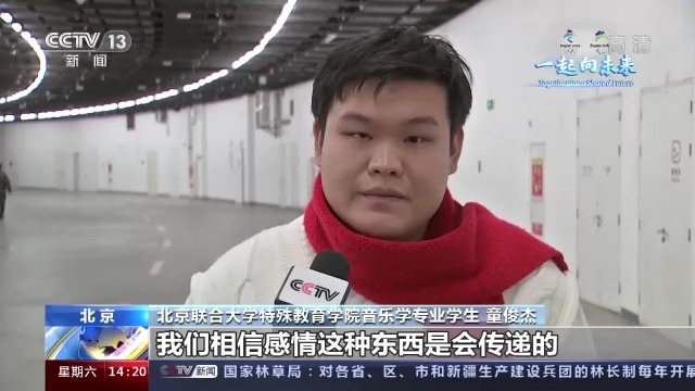 北京联合大学特殊教育学院音乐学专业学生 童俊杰:我们相信感情这种东西是会传递的。其他人志愿者也好,导演也好,我们的老师也好,观众也好,他们每一次呼唤,每一个呼吸,甚至我们离得近了,我们可以感受到他们的温度,在这些信息到达我们内心深处之后,我们一定是会有一个生发的过程,我们知道这个舞台,它是一个非常震撼的一个舞台效果,我们旁边的人对我们一定是非常充满希望,非常友善的。