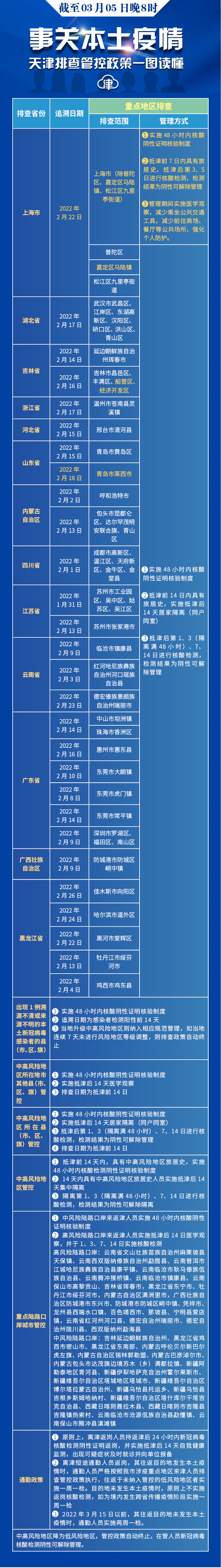 新增具有2022年2月16日(含)以来途经吉林省吉林市船营区、经济开发区、具有2022年2月22日(含)以来途经上海市嘉定区马陆镇、具有2022年2月18日(含)以来途经山东省青岛市莱西市旅居史的来津及返津人员,需持48小时内核酸阴性证明或出示包含核酸检测阴性信息的健康码“绿码”,主动向社区、工作单位等报备,抵津前14日内具有旅居史,实施抵津后14天居家隔离(同户同室)。