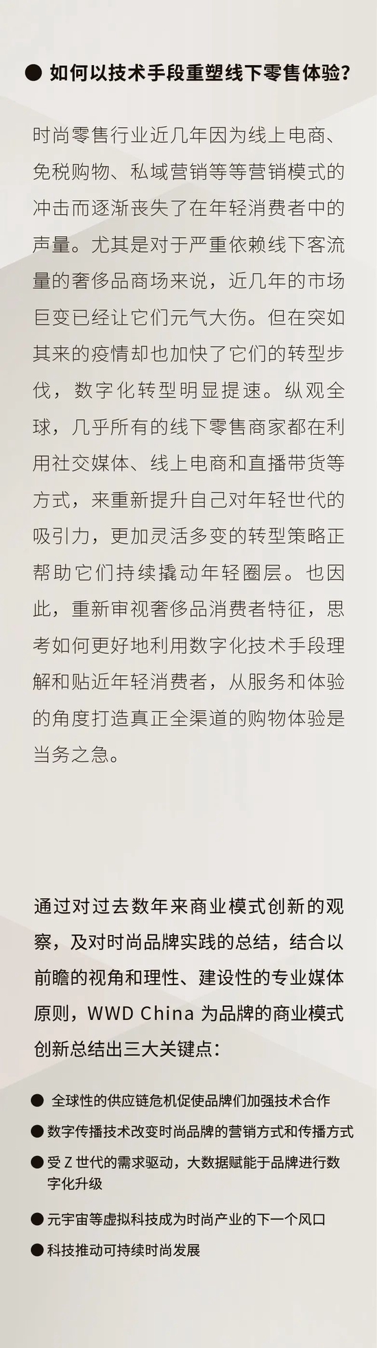 2021年,WWD China 见证了时尚产业在文化塑造、科技转型、可持续时尚践行、商业模式创新以及产品创新这五大维度上面的变革与创举。时尚产业的参与者们所取得的诸多成就,都是因为主动或不自觉地顺应了以上五大维度的范式和趋势。