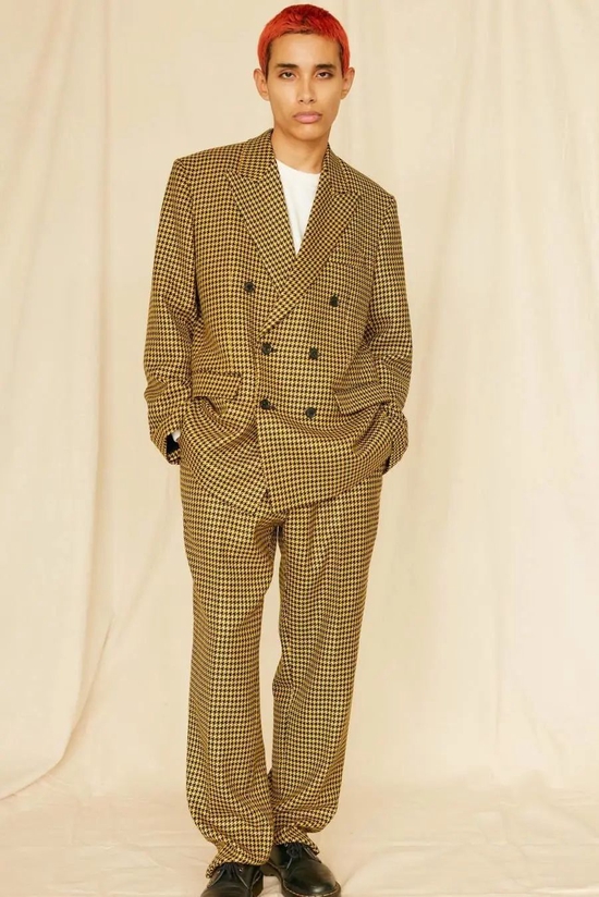 另一个从 Supreme 走出来的品牌 Awake,去年 2021 秋冬系列第一次加入了西服套装,宽松的 H 型裁剪,大垫肩、枪驳领、双排扣,共推出了黄色千鸟格与青草绿两款配色。