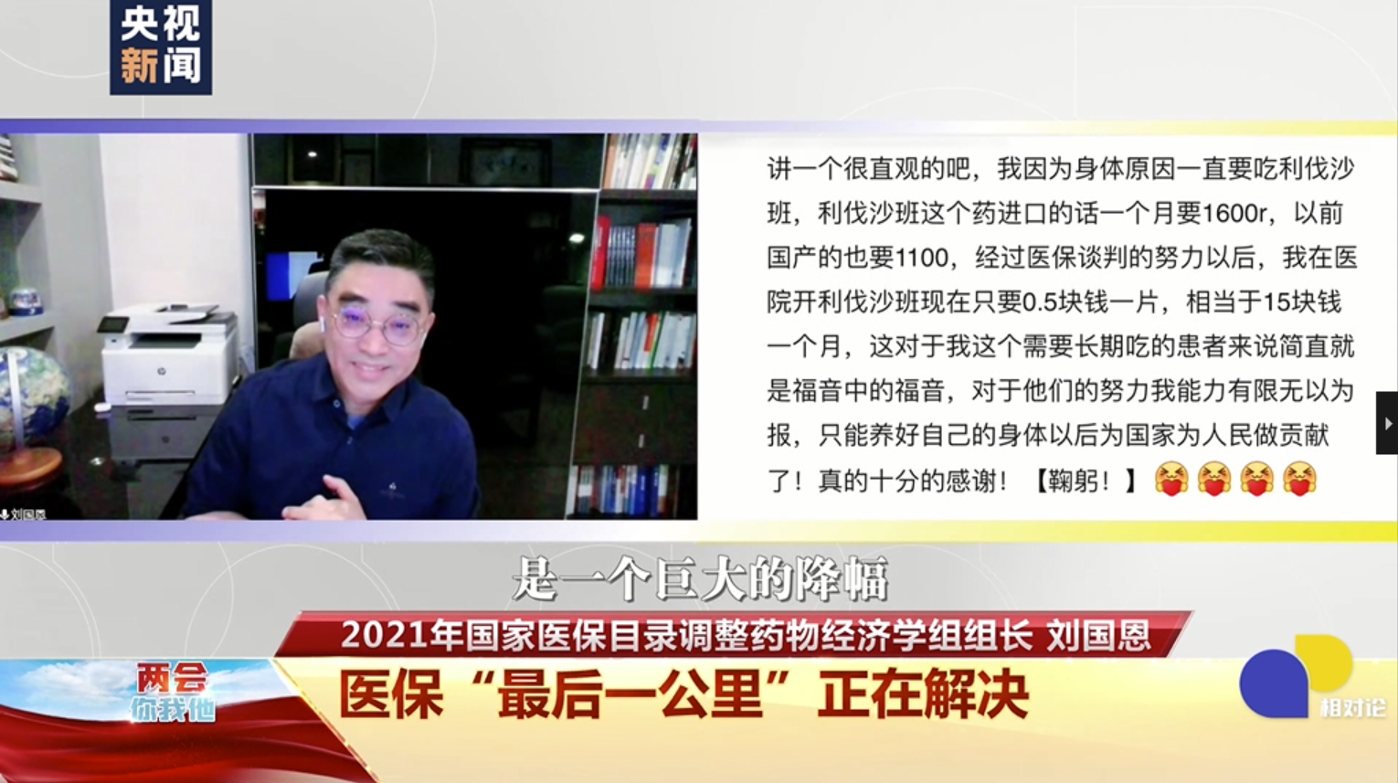刘国恩:看到这些评论,肯定是非常欣慰的,非常非常欣慰。国家医保局成立以来,在医保目录准入谈判、药品集中带量采购等方面做了很多工作,确实大大减轻了患者的经济负担。与此同时,从长远来看的话,国家支付能力、个人支付能力,不断提高才是根本。说一千道一万,最根本还是如何把我们中国的经济,更好地、持续地、稳定地,推向越来越好的增长水平。