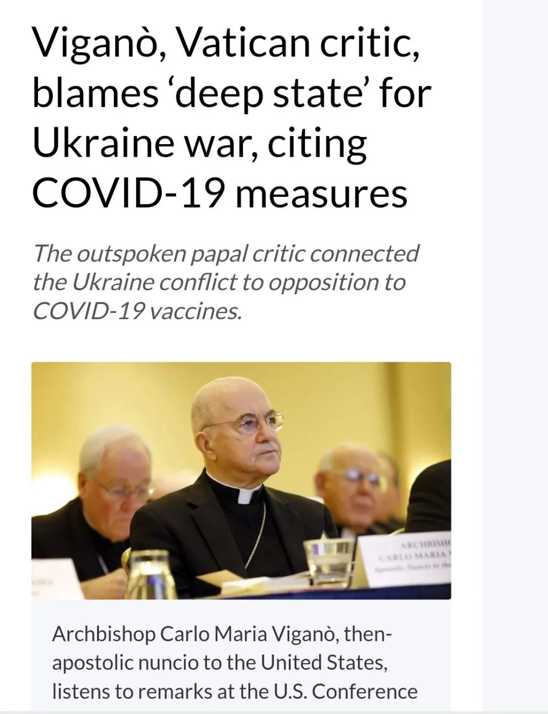 此前,这个极为支持美国前总统特朗普、亲近美国右翼保守派政治势力,同时极为反感罗马天主教教皇方济各包容同性恋等“反传统”做派的大主教,还曾多次发表过反华言论,称中国是天主教的“威胁”。他还在新冠疫情上多次发表过反智主义言论,称新冠疫情是被美国“深层政府”和中国一起制造出来的,好让新冠疫苗来控制全人类,而特朗普则是人类对抗这一“卫生专治”的“最后壁垒”。