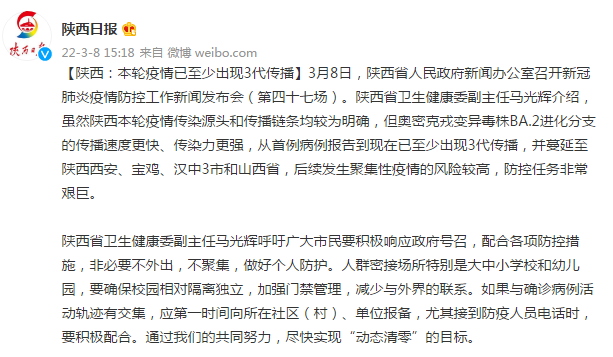 【陕西:本轮疫情已至少出现3代传播】3月8日,陕西省人民政府新闻办公室召开新冠肺炎疫情防控工作新闻发布会(第四十七场)。陕西省卫生健康委副主任马光辉介绍,虽然陕西本轮疫情传染源头和传播链条均较为明确,但奥密克戎变异毒株BA.2进化分支的传播速度更快、传染力更强,从首例病例报告到现在已至少出现3代传播,并蔓延至陕西西安、宝鸡、汉中3市和山西省,后续发生聚集性疫情的风险较高,防控任务非常艰巨。