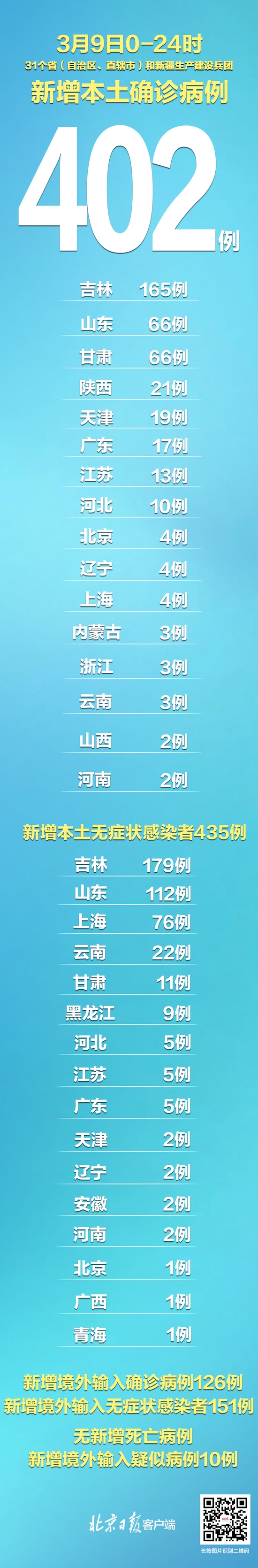 3月9日0—24时,31个省(自治区、直辖市)和新疆生产建设兵团报告新增确诊病例528例。其中境外输入病例126例,本土病例402例。新增无症状感染者586例,其中境外输入151例,本土435例。涉及吉林、山东、甘肃、陕西、北京等多省区市。本轮疫情,全国单日新增本土病例首次超过400例。
