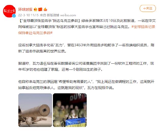 综合多家媒体3月10日及此前报道,一名在中文网络被冠以“全球最顶级”标签的加拿大狙击手也宣布自己已抵达乌克兰。