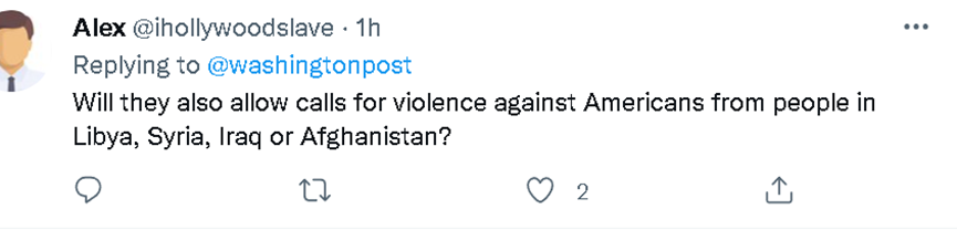 另外,也有不少网民指责Facebook立场双标,一位网民嘲讽道:“当被美国侵略的中东人民发表暴力言论时,我们不仅封杀他们的推文,还说他们是恐怖分子。”还有网民质问Facebook会不会给利比亚、叙利亚、伊拉克和阿富汗这种谴责和威胁美国的“自由”。