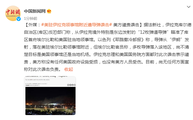 【外媒:#美驻伊拉克领事馆附近遭导弹袭击# 美方谴责袭击】据法新社,伊拉克库尔德自治区(库区)反恐部门称,从伊拉克境外特别是东边发射的“12枚弹道导弹”瞄准了库区首府埃尔比勒和美国驻当地领事馆。以色列《耶路撒冷邮报》称,导弹从“伊朗”发射,落在美驻埃尔比勒领事馆附近,但埃尔比勒官员称,多枚导弹落入该地区,尚不清楚目标是美国领事馆还是当地机场。伊拉克总理和美国国务院方面都对此次袭击表示谴责,美方称没有任何美国政府设施受损,也没有美方人员受伤。目前,尚无任何方面宣称对此次袭击负责。