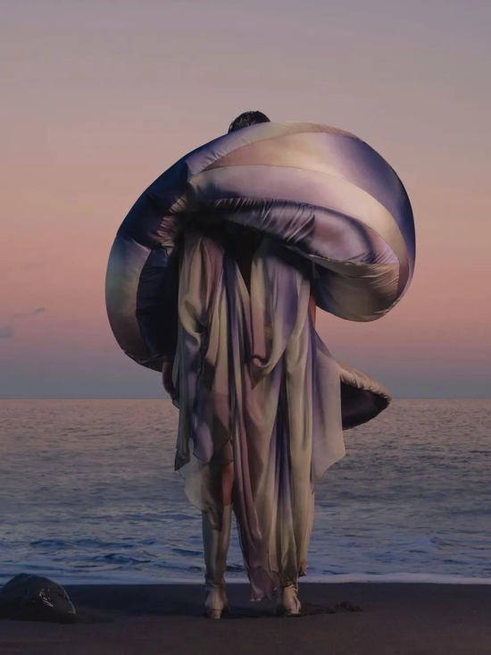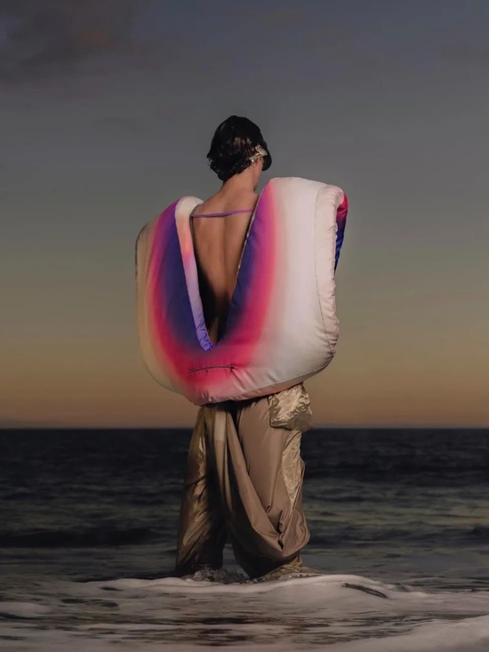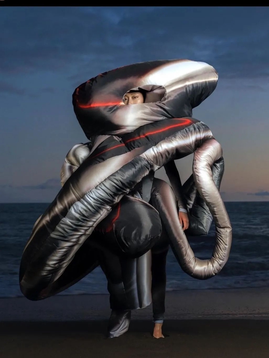 如今,在 Izzy Du 花费七个月时间精心制作的最新作品,同样受到 3D 打印配件和自然灵感纹理的影响。该服装系列由太阳能纤维和疏水技术制成的‘可穿戴能量’智能服装,在廓形设计围绕着结构体块和悬垂感之间的作为对比,运用夸张、扭成一团的形状及宛若金属般的反光材质,看上去‘酸’味十足。