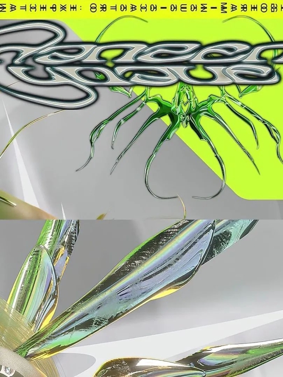 高饱和折射材质:如流体、玻璃折射等元素。是打造‘酸性’视觉感染力的必备点缀。将暗色调配合荧光色点亮画面,结合镭射光谱效果,迷幻绚烂的奇幻体验感;