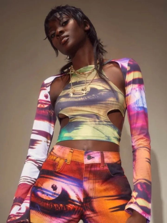 服装方面,本季也有不少品牌运用酸性美学元素,如强酸流液体腐蚀后的晕染、渐变印花图案开始大量地映入大众眼帘。最值得一提的即是创立于 2013 年的个性辣妹服饰品牌 Jaded London 。