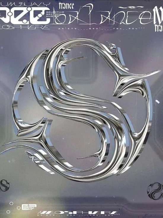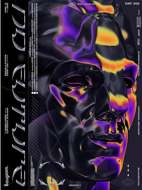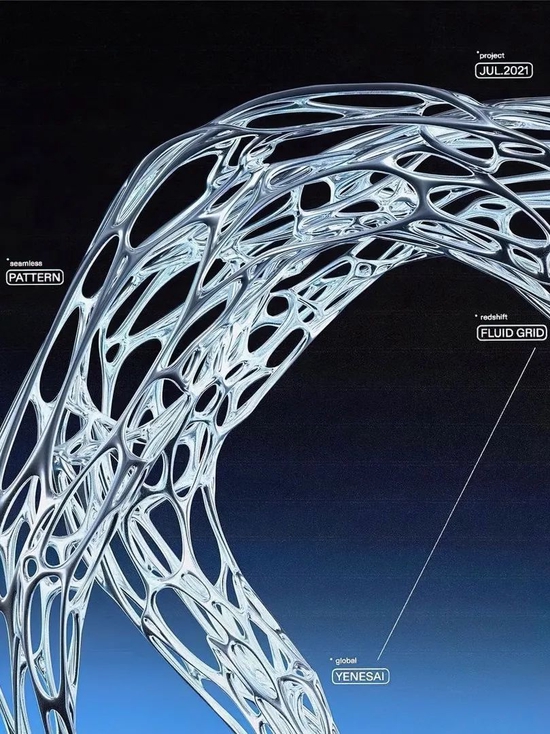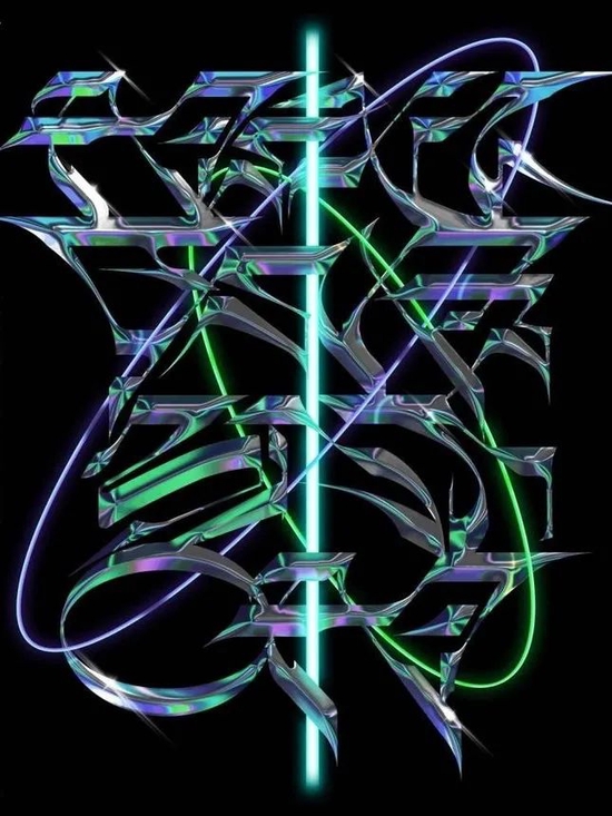 金属质感:酸性设计主要的设计元素之一,当实验性金属液体质感遇上怀旧的霓虹色调,将色彩营造出反差视觉感官,仿佛令人一眼陷入迷幻的未来旋涡;