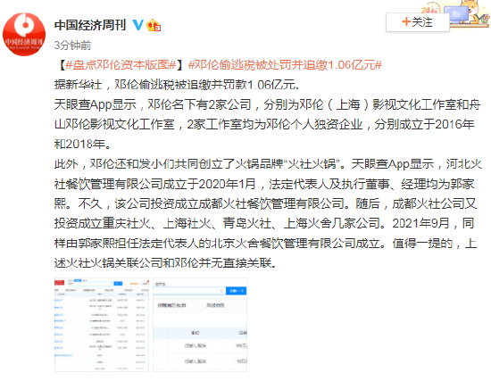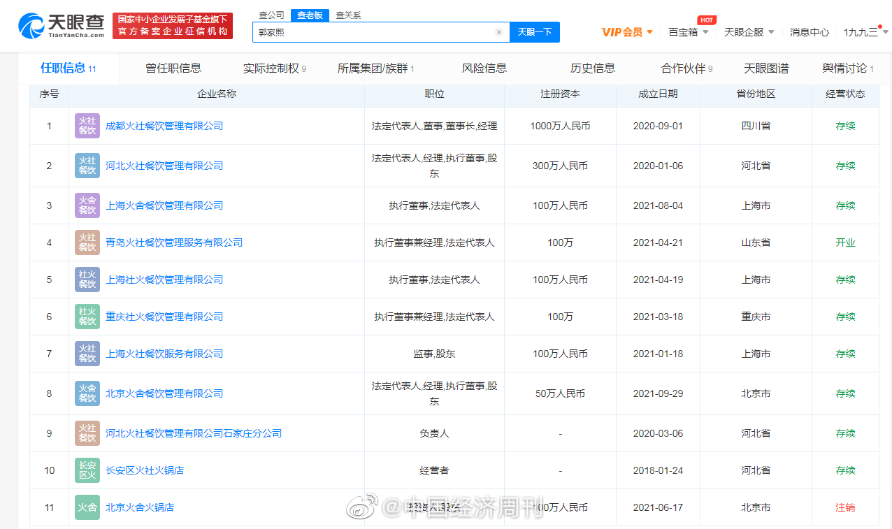 此外,邓伦还和发小们共同创立了火锅品牌“火社火锅”。天眼查App显示,河北火社餐饮管理有限公司成立于2020年1月,法定代表人及执行董事、经理均为郭家熙。不久,该公司投资成立成都火社餐饮管理有限公司。随后,成都火社公司又投资成立重庆社火、上海社火、青岛火社、上海火舍几家公司。2021年9月,同样由郭家熙担任法定代表人的北京火舍餐饮管理有限公司成立。值得一提的,上述火社火锅关联公司和邓伦并无直接关联。