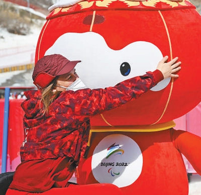 3月10日,国家高山滑雪中心,加拿大代表团的一名成员拥抱北京冬残奥会吉祥物“雪容融”。
