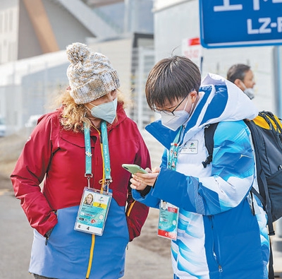 3月9日,国家冬季两项中心,志愿者(右)帮助外国记者查看班车时刻表。