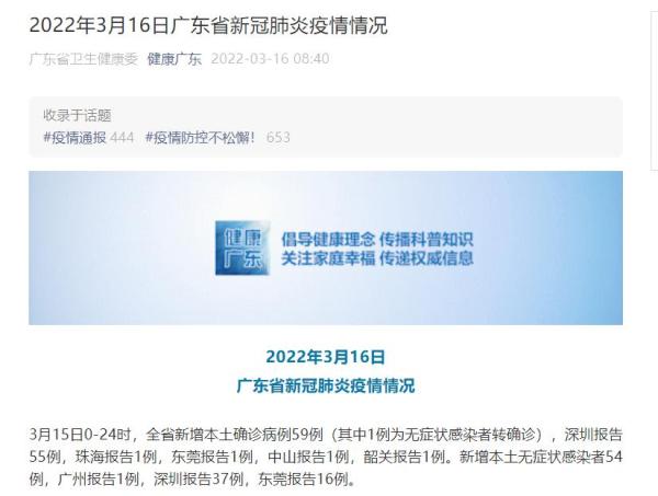 3月15日0-24时,广东省新增本土确诊病例59例(其中1例为无症状感染者转确诊),深圳报告55例,珠海报告1例,东莞报告1例,中山报告1例,韶关报告1例。新增本土无症状感染者54例,广州报告1例,深圳报告37例,东莞报告16例。