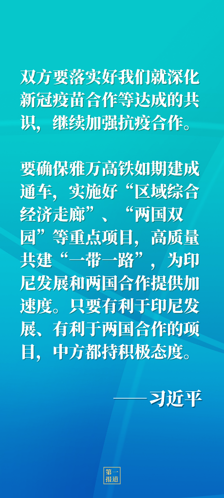 习近平强调,双方要落实好我们就深化新冠疫苗合作等达成的共识,继续加强抗疫合作。要确保雅万高铁如期建成通车,实施好“区域综合经济走廊”、“两国双园”等重点项目,高质量共建“一带一路”,为印尼发展和两国合作提供加速度。只要有利于印尼发展、有利于两国合作的项目,中方都持积极态度。双方要维护全球市场稳定和供应链畅通,推动全球发展倡议落地走实,坚定维护以东盟为中心、开放包容的区域架构,坚持团结合作、互利共赢。中方支持印尼发挥二十国集团主席国作用,聚焦“共同复苏、强劲复苏”主题,办好巴厘岛峰会。