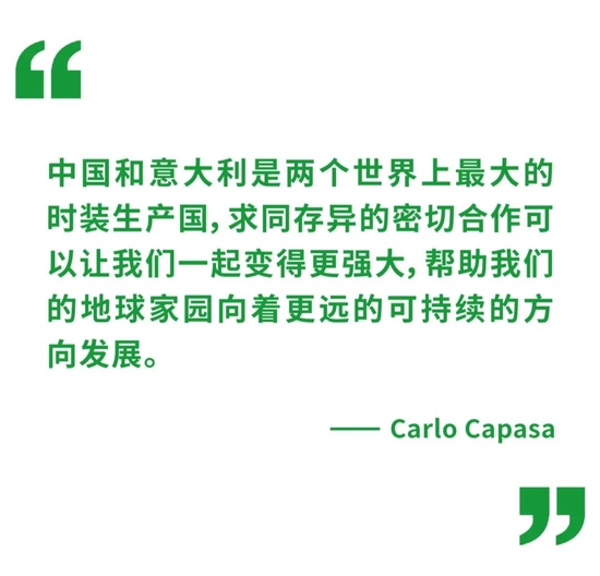 Carlo Capasa 先生的发言除了介绍意大利国家时装商会自 2011 年即已经开始的可持续发展努力进程和成果,更重要的内容集中在强调“协作”之于这项事业的重要性并呼吁行业的共同行动。