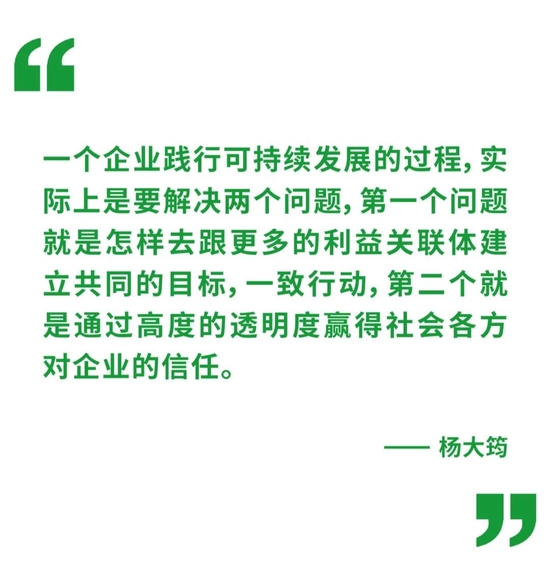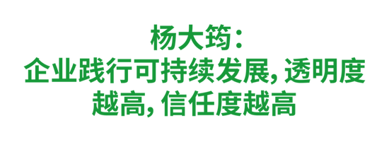 “在执行可持续发展的过程中,企业实际上的执行力度好坏是有衡量标准的。其中有一个标准就是透明度。即你是否愿意把原先不愿意公布的一些资讯,让你的消费者、投资人,政府、利益关联方都能清楚看到,并因此赢得‘社会对企业的信任’,透明度越高,信任度越高。事实上,一个企业践行可持续发展的过程,实际上是要解决两个问题,第一个问题就是怎样去跟更多的利益关联体建立共同的目标,一致行动,第二个就是通过高度的透明度赢得社会各方对企业的信任。”