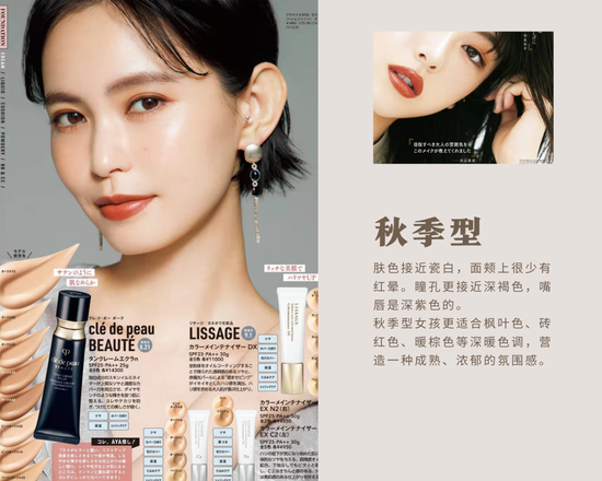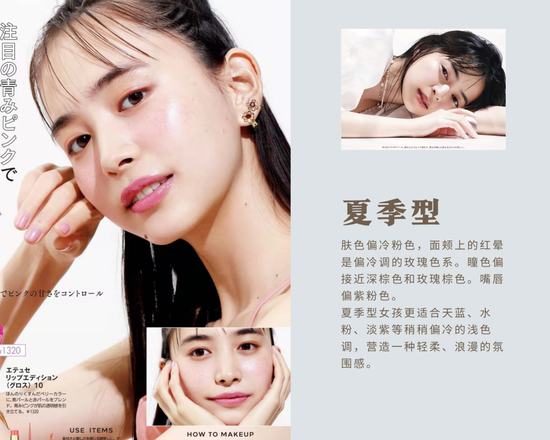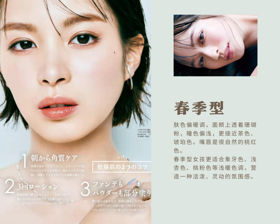 作为一个尽职尽责的美妆博主,拖拖也是速速开始学习起了这类日系妆容的要点。经过我的仔细研究,机智的拖拖发现,日系妆容对于颜色和风格的分类其实自有一套理论基础——那就是日杂中经常用到的“四季色彩理论”。它根据不同的长相和特征,将不同色系和风格简化成了四种类型,并以春、夏、秋、冬四个季节命名。这种分类方式,实在很适合帮助我们找准自己的妆容风格哦~