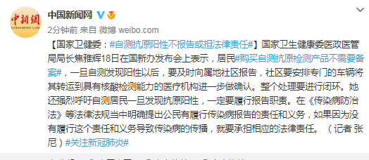 国家卫生健康委医政医管局局长焦雅辉18日在国新办发布会上表示,居民购买自测抗原检测产品不需要备案,一旦自测发现阳性以后,要及时向属地社区报告,社区要安排专门的车辆将其转运到具有核酸检测能力的医疗机构进一步做确认。整个处理要进行闭环。她还强烈呼吁自测居民一旦发现抗原阳性,一定要履行报告职责。在《传染病防治法》等法律法规当中明确提出公民有履行传染病报告的责任和义务,如果因为没有履行这个责任和义务导致传染病的传播,就要承担相应的法律责任。