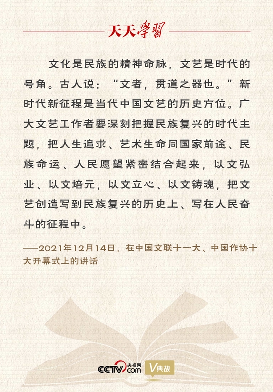 文化兴则国家兴,文化强则民族强。在中国文联十一大、中国作协十大开幕式上,习近平总书记深刻阐明了文艺在全面建设社会主义现代化国家、实现中华民族伟大复兴中国梦中的重要地位和作用,为新时代中国文艺指明了前进方向。