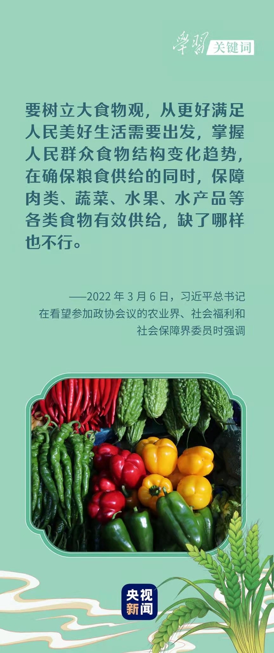 3月6日,习近平总书记在看望参加全国政协十三届五次会议的农业界、社会福利和社会保障界委员时,强调要树立大食物观,从更好满足人民美好生活需要出发,掌握人民群众食物结构变化趋势,在确保粮食供给的同时,保障肉类、蔬菜、水果、水产品等各类食物有效供给,缺了哪样也不行。