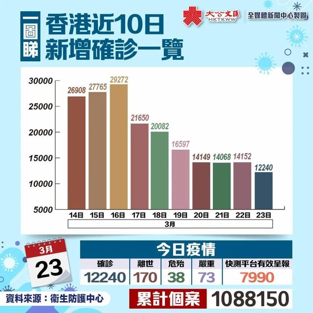 据香港大公文汇全媒体3月23日消息,香港卫生防护中心传染病处首席医生欧家荣公布,截至当天零时,香港新增12240宗确诊个案。目前,香港第五波疫情累计1075519宗个案(692521宗为核酸阳性个案,382998宗为快测阳性呈报个案)。