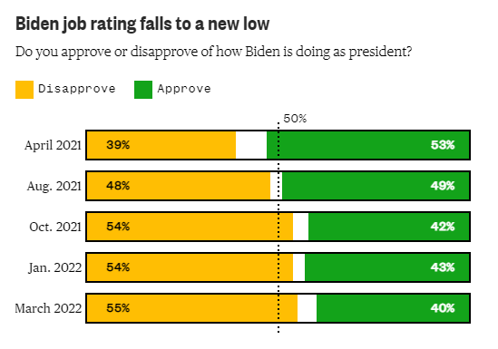 调查发现,40%的受访者对拜登的执政表现表示满意,55%的人表示不满意——这是拜登任期内在NBC民意调查中的最低水平。