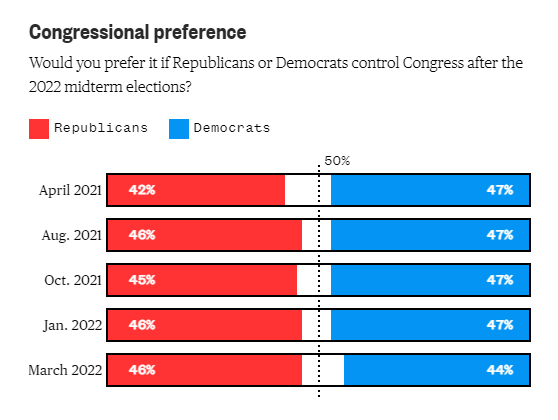 此外,根据调查结果,随着美国2022年的中期选举的临近,有46%的受访者(18 岁及以上的登记选民)更希望共和党控制国会,而44%的受访者表示他们希望拜登所属的民主党控制国会。NBC称,这是自 2014 年以来共和党首次在NBC民调中的这项问题上领先。