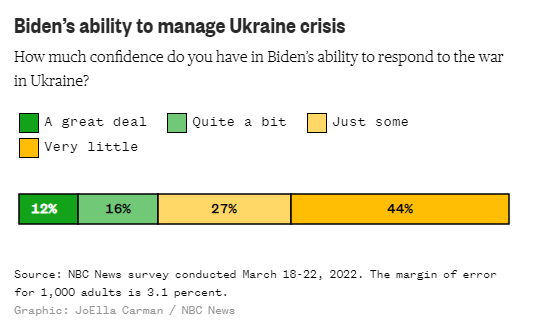 调查还发现,71%的受访者表示他们对拜登应对乌克兰战争的能力“只有一些”(27%)或“很少”(44%)的信心。只有28%的受访者表示他们对此有“很大”(12%)或“相当大”(16%)的信心。