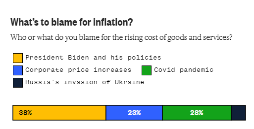眼下,美国通货膨胀水平持续高企。当被问及导致通货膨胀加剧的原因时, 38%的受访者将矛头指向拜登和他的政策。当被问及拜登应该优先考虑的问题是什么——降低通货膨胀水平和改善经济,还是努力结束乌克兰战争时,68%的人选择了通货膨胀和经济问题,而选择后者的受访者比例仅为29%。