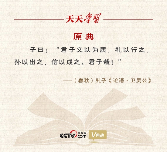 《论语·卫灵公》记载了孔子关于“义”的一段论述。孔子说:“君子义以为质,礼以行之,孙以出之,信以成之。君子哉!”此句中孙(xùn)同“逊”,谦逊。意思是说,君子以义作为立身之本,用礼加以推行,用谦逊的言辞来表达,用诚实的态度去完成。这就是君子啊!另外,在《论语·阳货》中,孔子还有类似表述:“君子义以为上。”