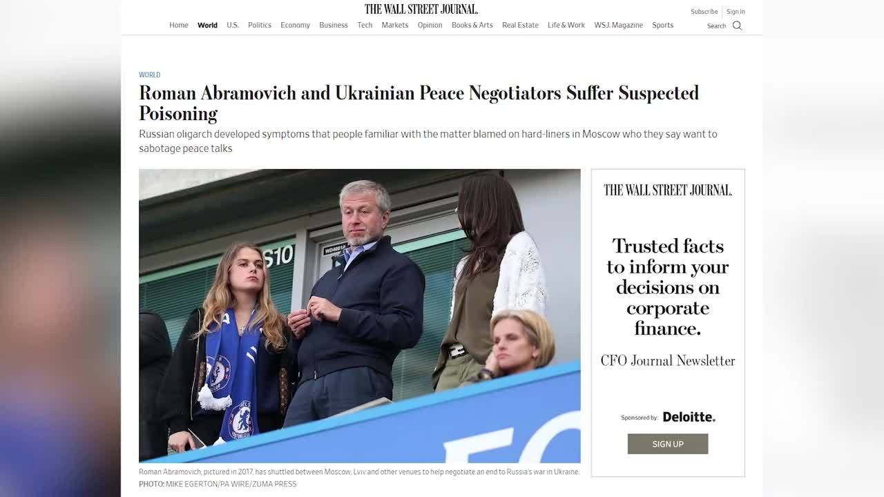 3月28日,荷兰调查机构Bellingcat和美国《华尔街日报》援引消息称,在与乌克兰谈判代表在基辅会面后,俄罗斯富豪阿布拉莫维奇(Roman Abramovich)出现了眼睛发红、持续流泪、脱皮等症状。有专家表示,“因不明化学武器中毒”是出现上述症状最有可能的原因。