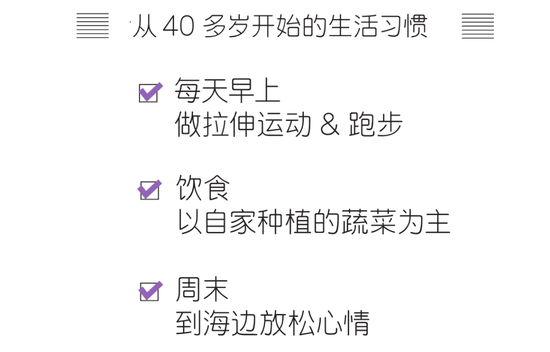 山本:我坚决不吃含有添加剂的食品,此外保持运动,一点点地为身体打好基础,如此一来应该能成为冻龄人。