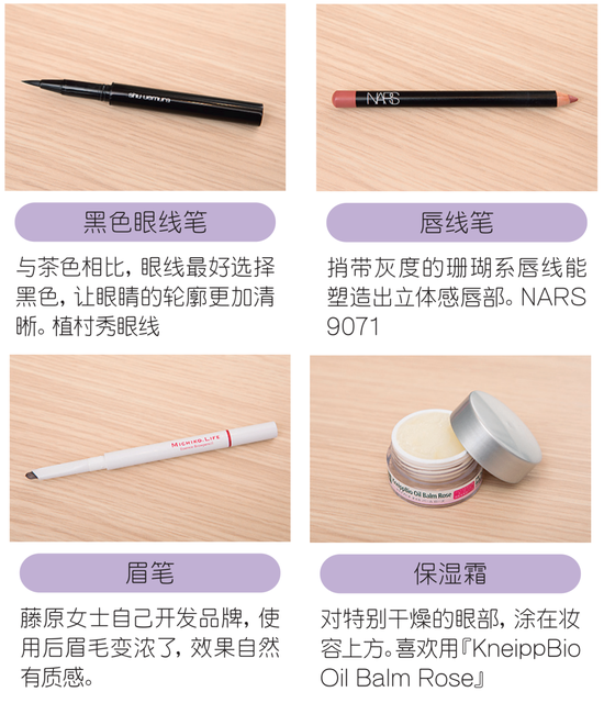 藤原:饮食和运动等所有生活习惯都会呈现在皮肤状态上,只有整体护理才能算真正完成化妆。就我自己来说,周末会去下田的家里吃些有机蔬菜为主的食物。在饮食方面,整体控制糖分摄入或不吃小麦粉,我尝试了很多种方法,最终发现还是保持饮食的均衡是最有效的。