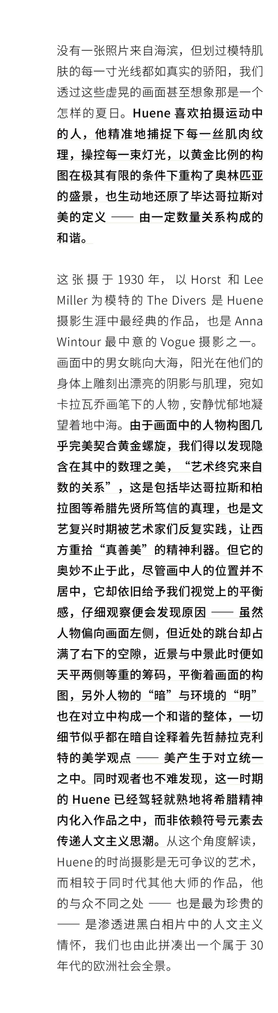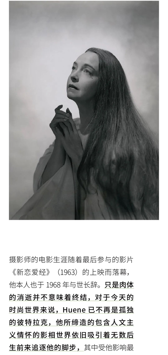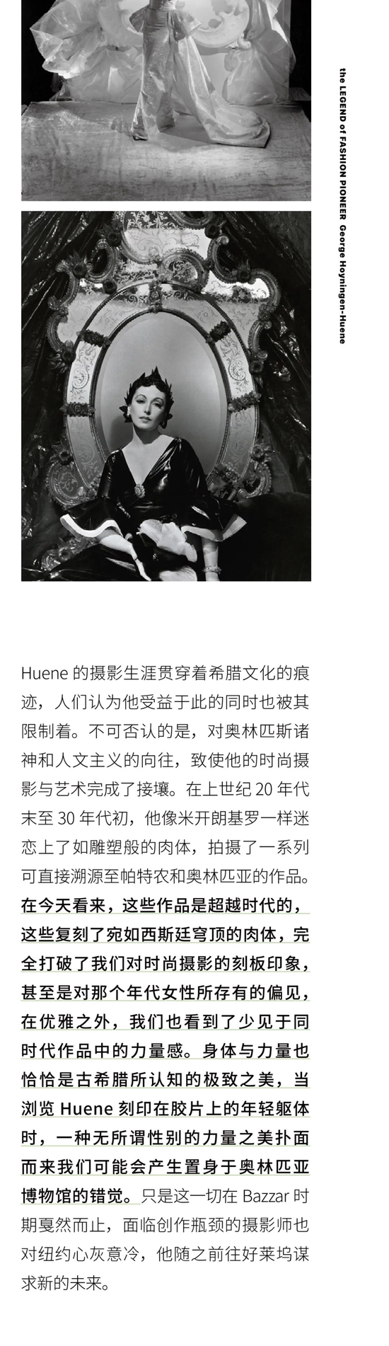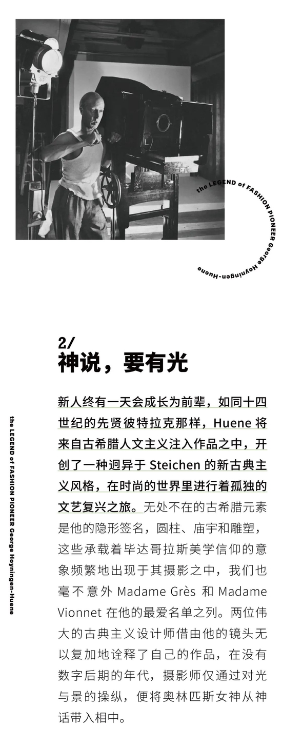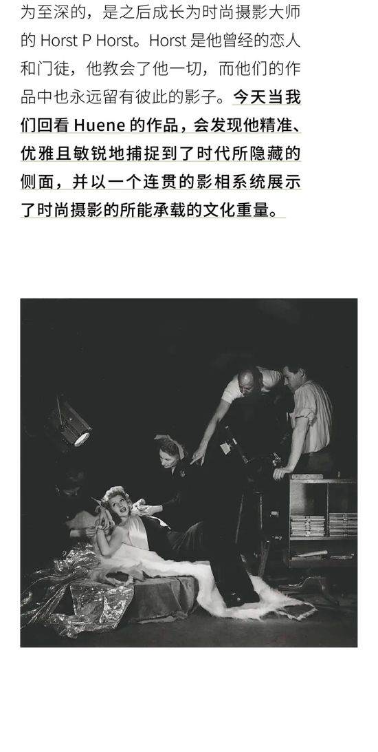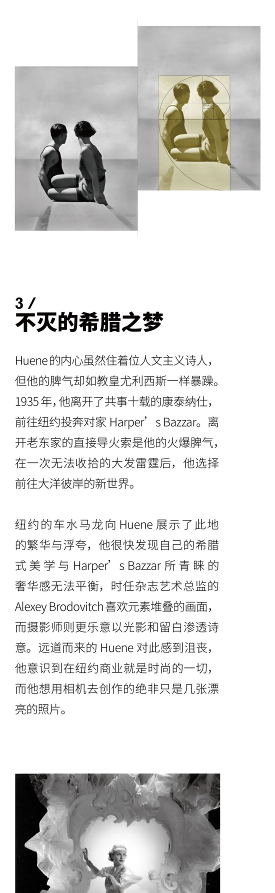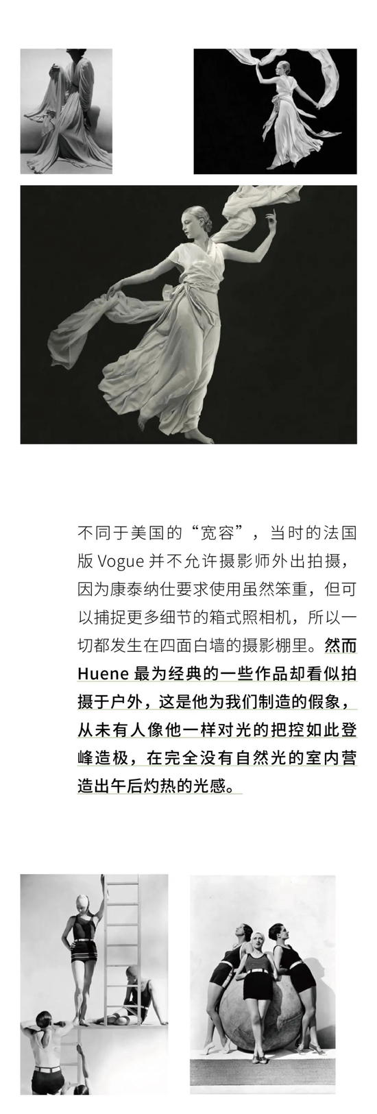 年轻时的 Huene 很崇拜和憧憬 Edward Steichen,尽管他曾袒露自己渴望拍出和 Steichen 一样优秀的作品,但这样的发言遭到了康泰纳仕管理层的否定,毕竟在当时 Steichen 是时尚摄影界不可撼动的存在,他们不需要一个模仿者。尽管在此碰了壁,但 Huene 为了能在 Vogue 摄影棚里多呆一会儿,他总是积极地去帮摄影师布景和调光。直到一天,本该出现的摄影师临时爽约,对棚内工作了如指掌的 Huene 随即接替了他的工作,也正是这次偶然,开启了他在 Vogue 的时尚摄影师生涯。