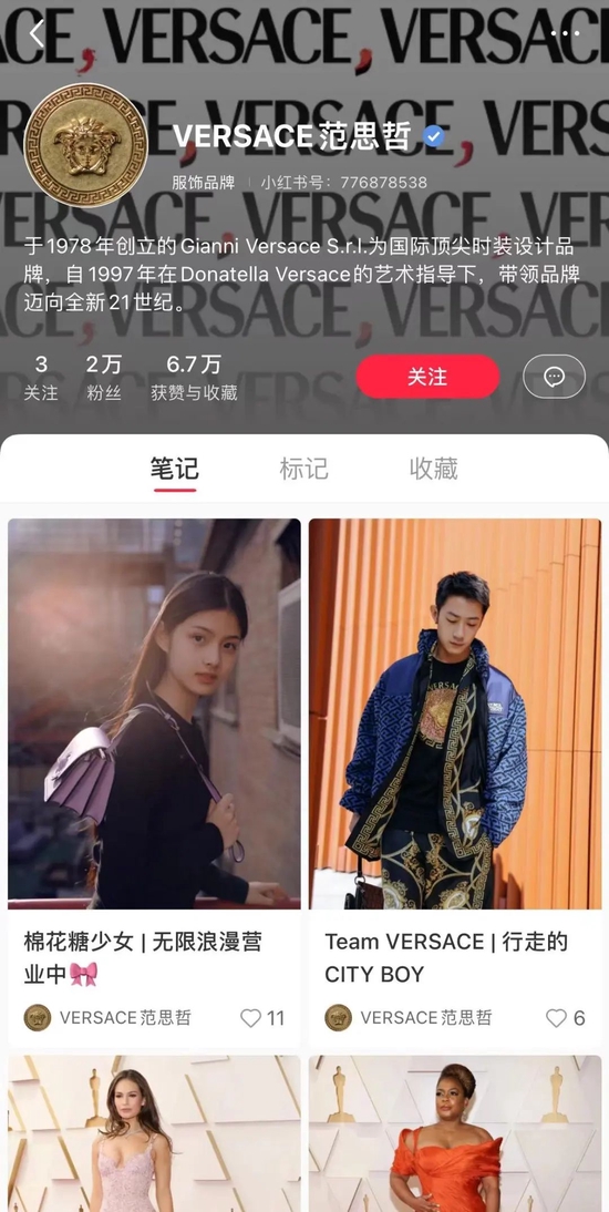 自 2020 年 Versace 进驻小红书后,已产出数十篇帖子,累积粉丝超过两万。从发布内容来看,最初的三个月以明星同款为主,尝试引流用户到官方小程序购买,并未突出某一款热卖单品。从 2020 年年底开始,Versace 小红书渐入佳境,不但开始聚焦美杜莎系列、迷宫系列的招牌单品推出穿搭攻略,并采取 emoji 表情分段、设置专属 hashtag 等具有小红书特色的表达形式。2022 年 1 月,Versace 又推出#TeamVersace 项目,发布品牌在中国原创的素人上身街拍,据了解,该内容仅在小红书和抖音平台发布。